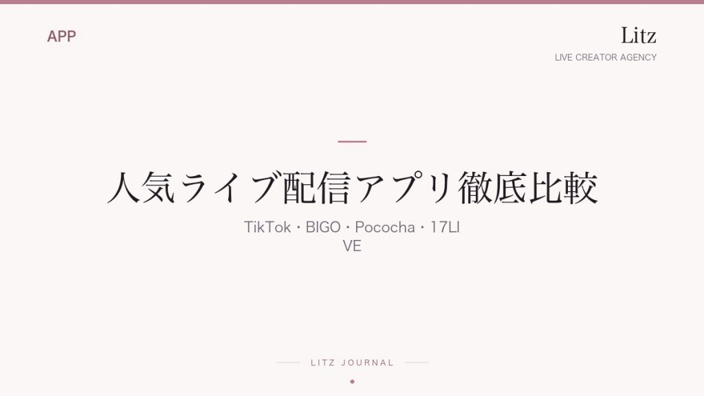 ライブ配信アプリ11種(TikTok・17LIVE・Pococha・IRIAM・REALITY・BIGO・SHOWROOM・ツイキャス・ふわっち等)を徹底比較。目的別おすすめ・選び方フローチャート・各アプリの詳細記事へのリンク【2026年】 -