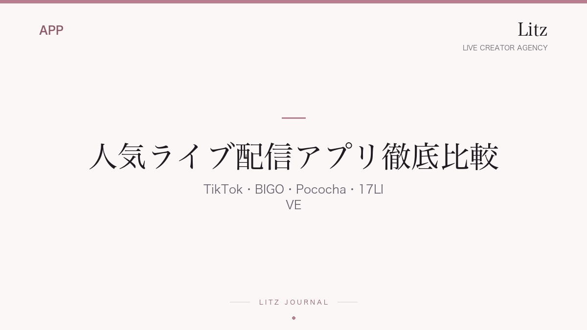 Litzは主要5アプリすべてに対応。1人のライバーが複数アプリを掛け持ちしても、専任マネージャーが一括サポート。1つのアプリでランキングが伸び悩んだとき、別アプリへのスムーズな移行も支援します。アプリ選びで迷っている方こそ、まずはご相談ください。